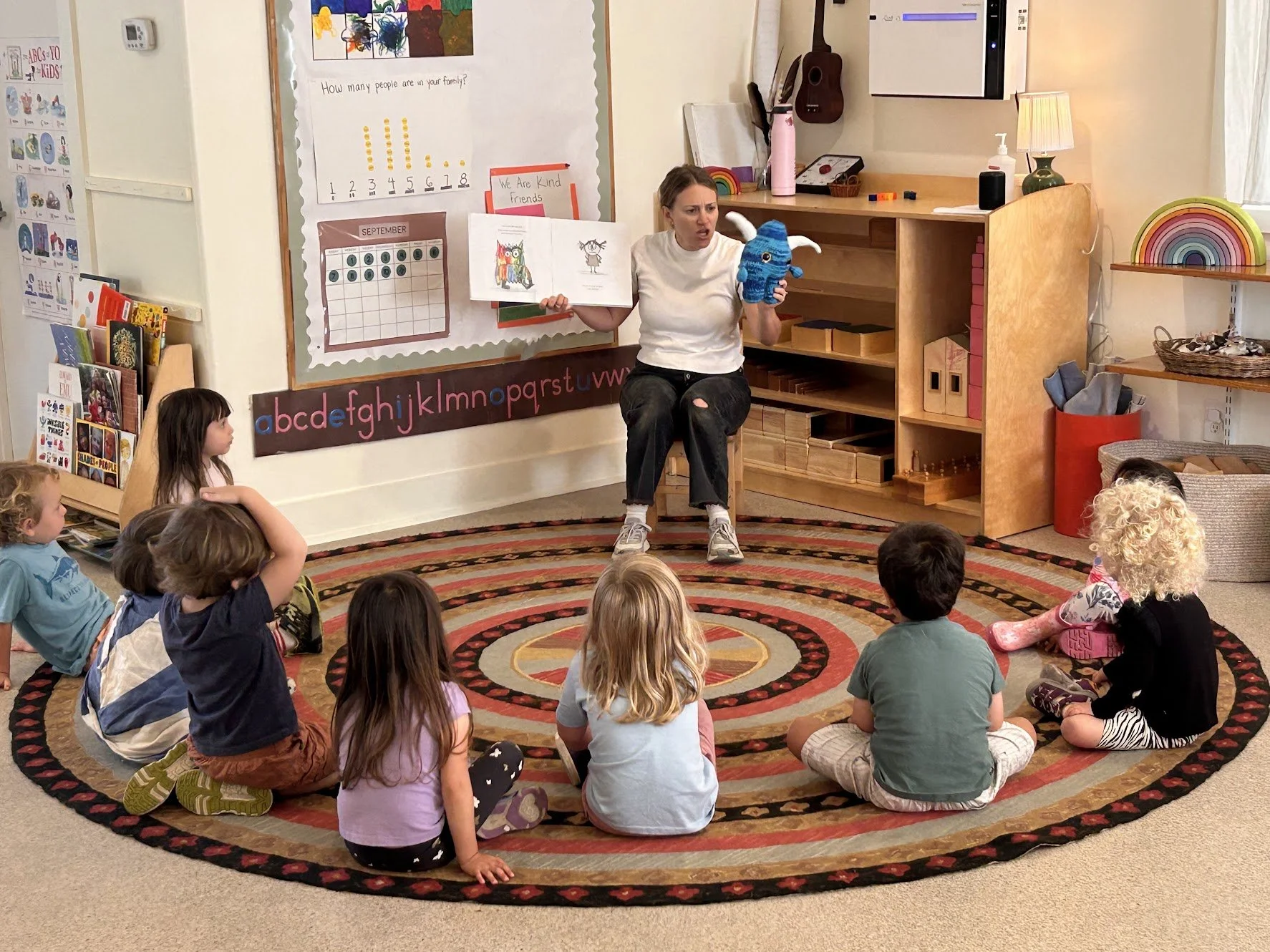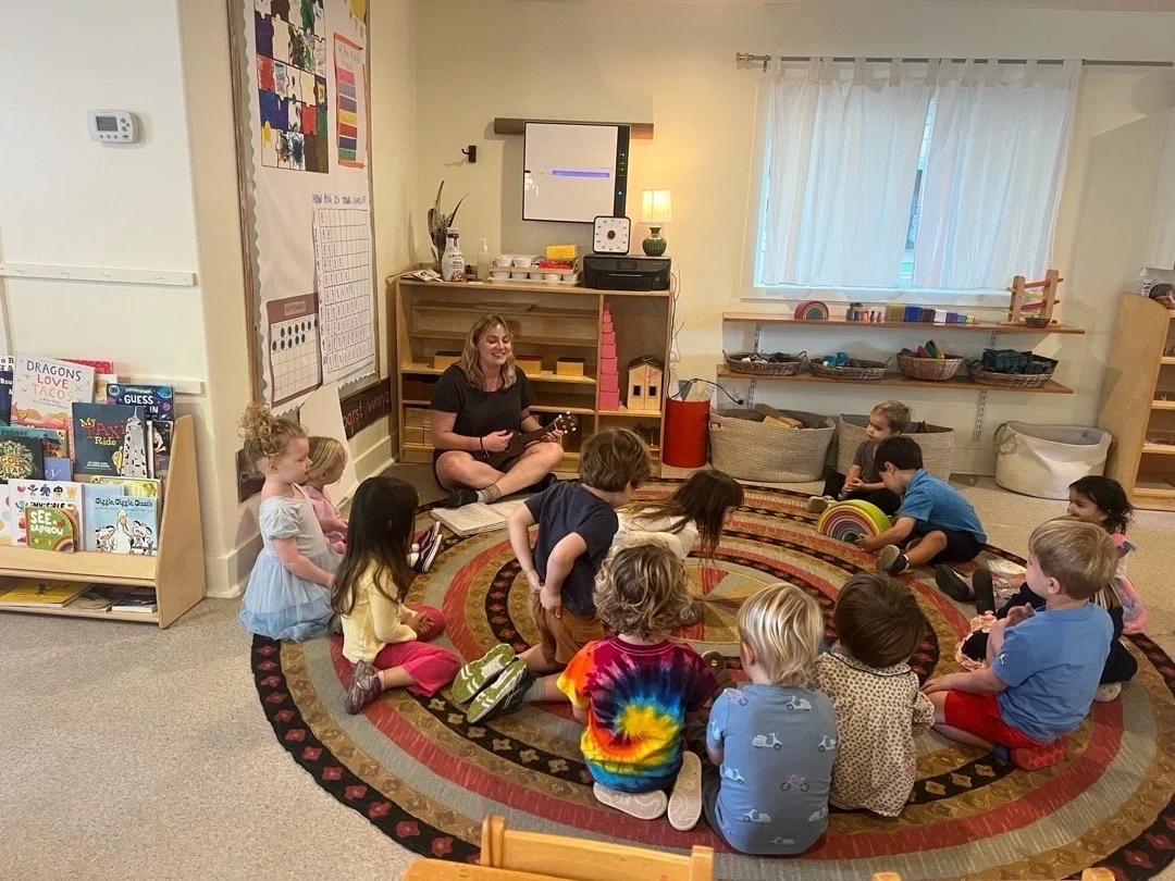 During circle time, one of the children’s favorite songs is Jump Up to the Circle. Teacher Ana plays it on the ukulele, and each child gets a turn to jump into the middle of the circle, choose an animal or object to be, and act it out. This activity encourages creativity, builds confidence, and gives children a fun way to practice taking turns, patience, and speaking in front of the group.