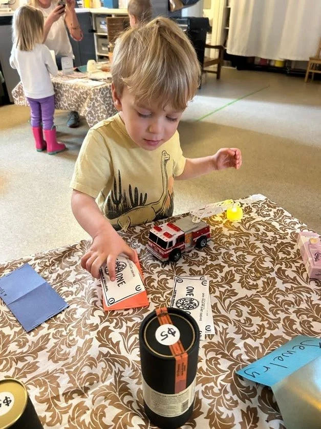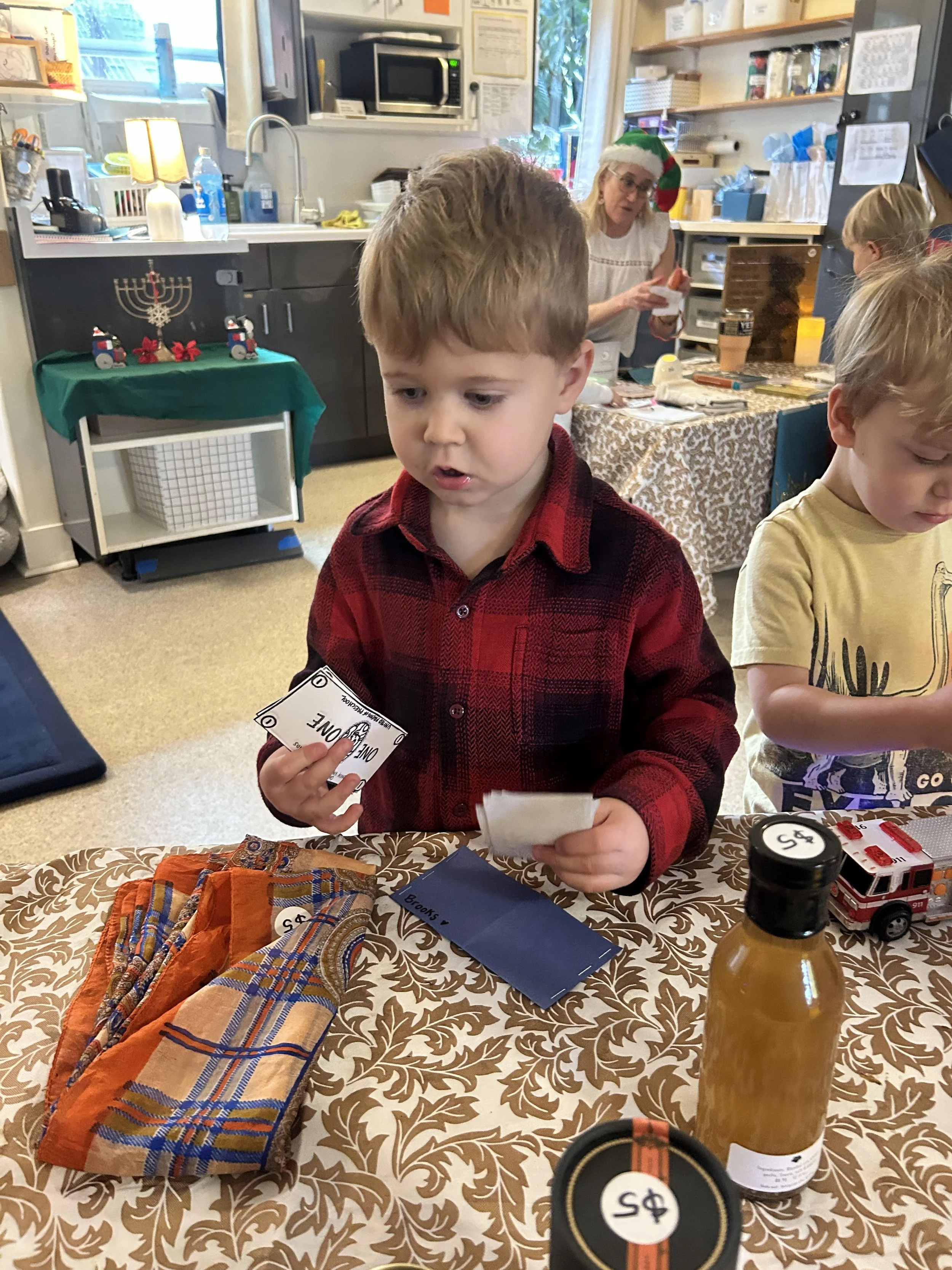 Items were clearly priced, and children engaged in early mathematical thinking as they counted money, matched quantities to numerals, and problem-solved when determining whether they needed change. Some of our older children thoughtfully planned their spending to ensure they could purchase gifts for multiple family members, while younger children were beginning to understand the concept of exchanging money for goods.