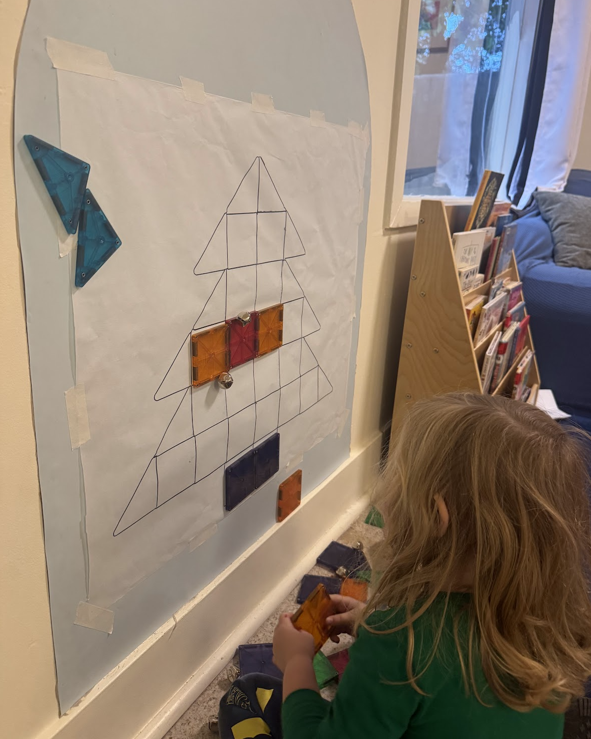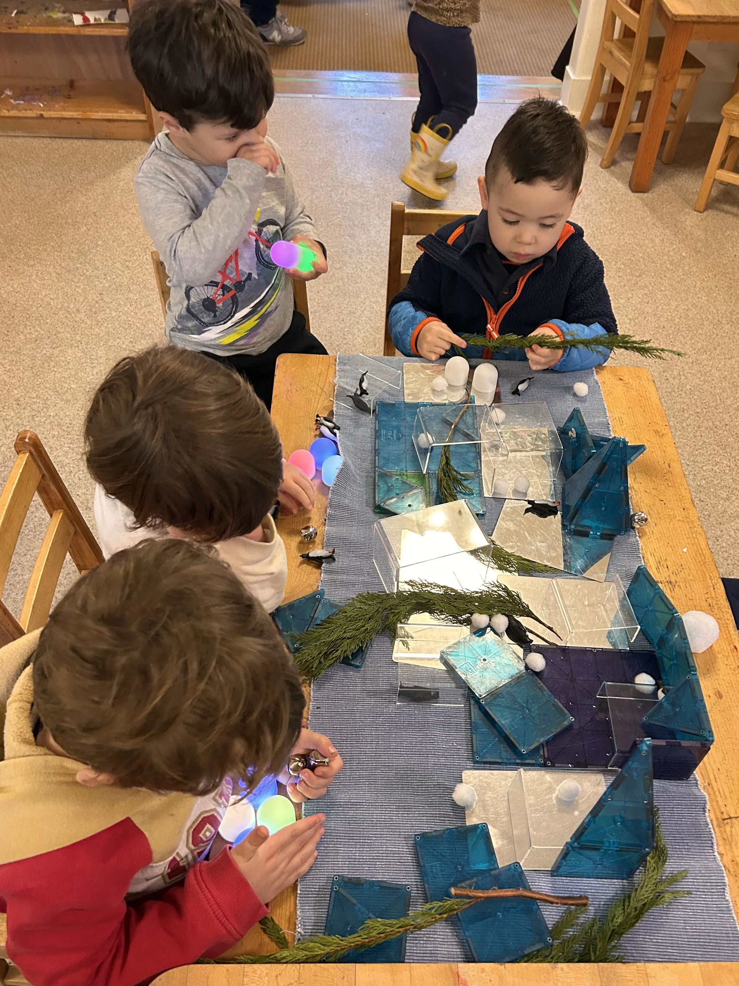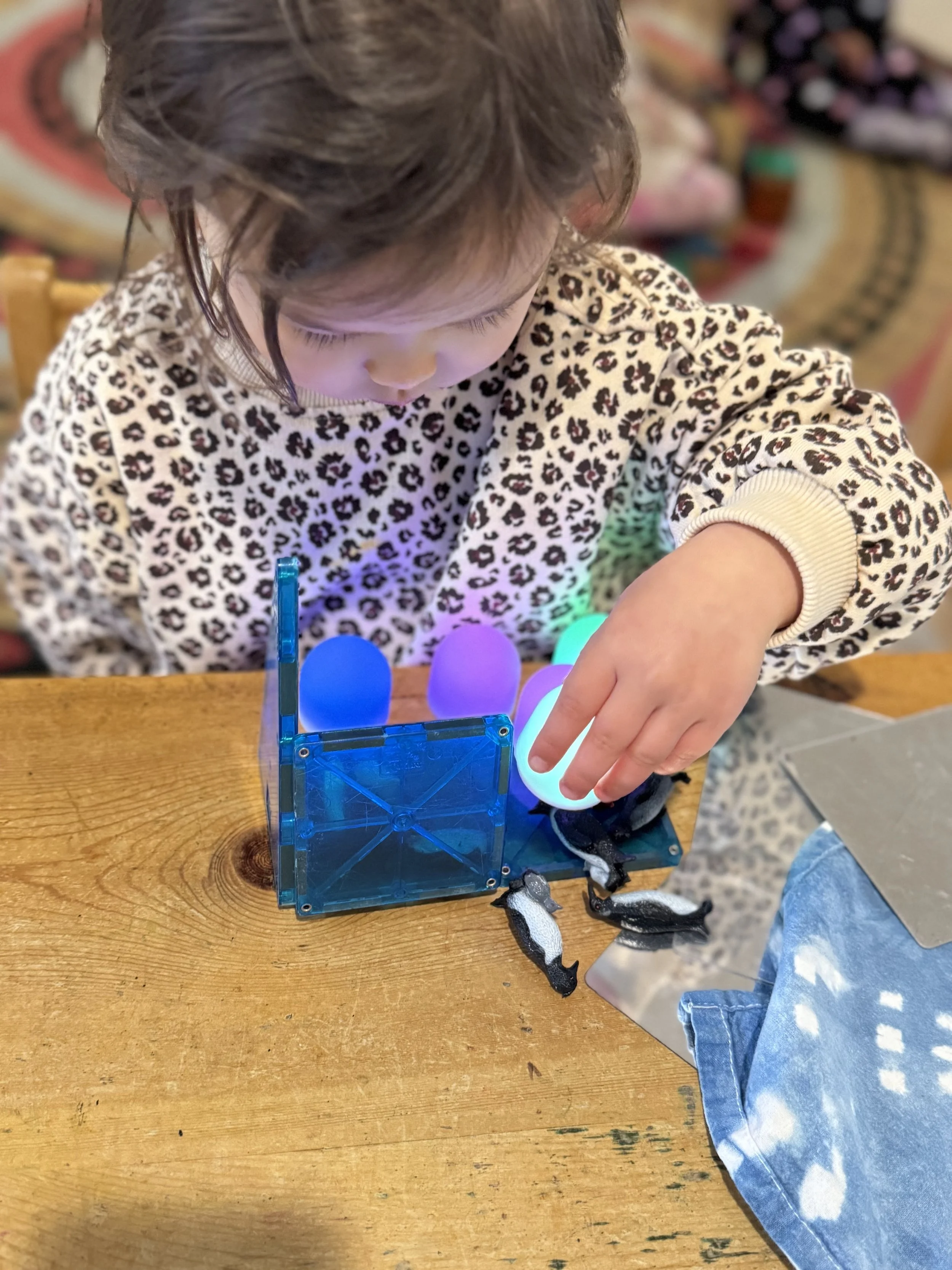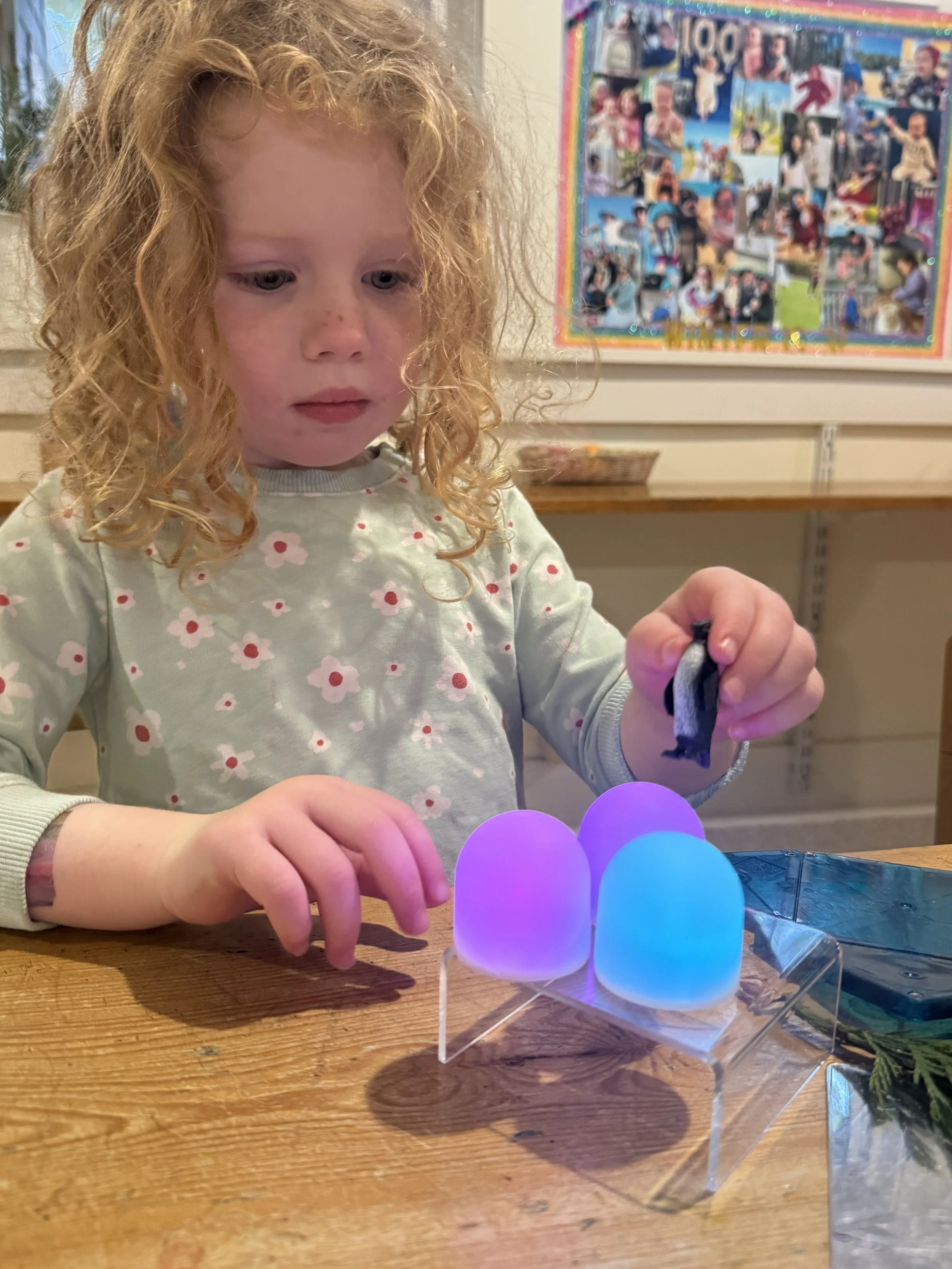 Symbolic & representational thinking: We set up a small world play scenario of penguins, magantiles, mirrors, pine needles, and glow lights. When children use small figures to act out scenarios, they’re practicing symbolic thinking. A penguin can stand in for real animals, ideas, or even the child themselves. This kind of representational play is a key foundation for later abstract thinking, storytelling, and literacy.