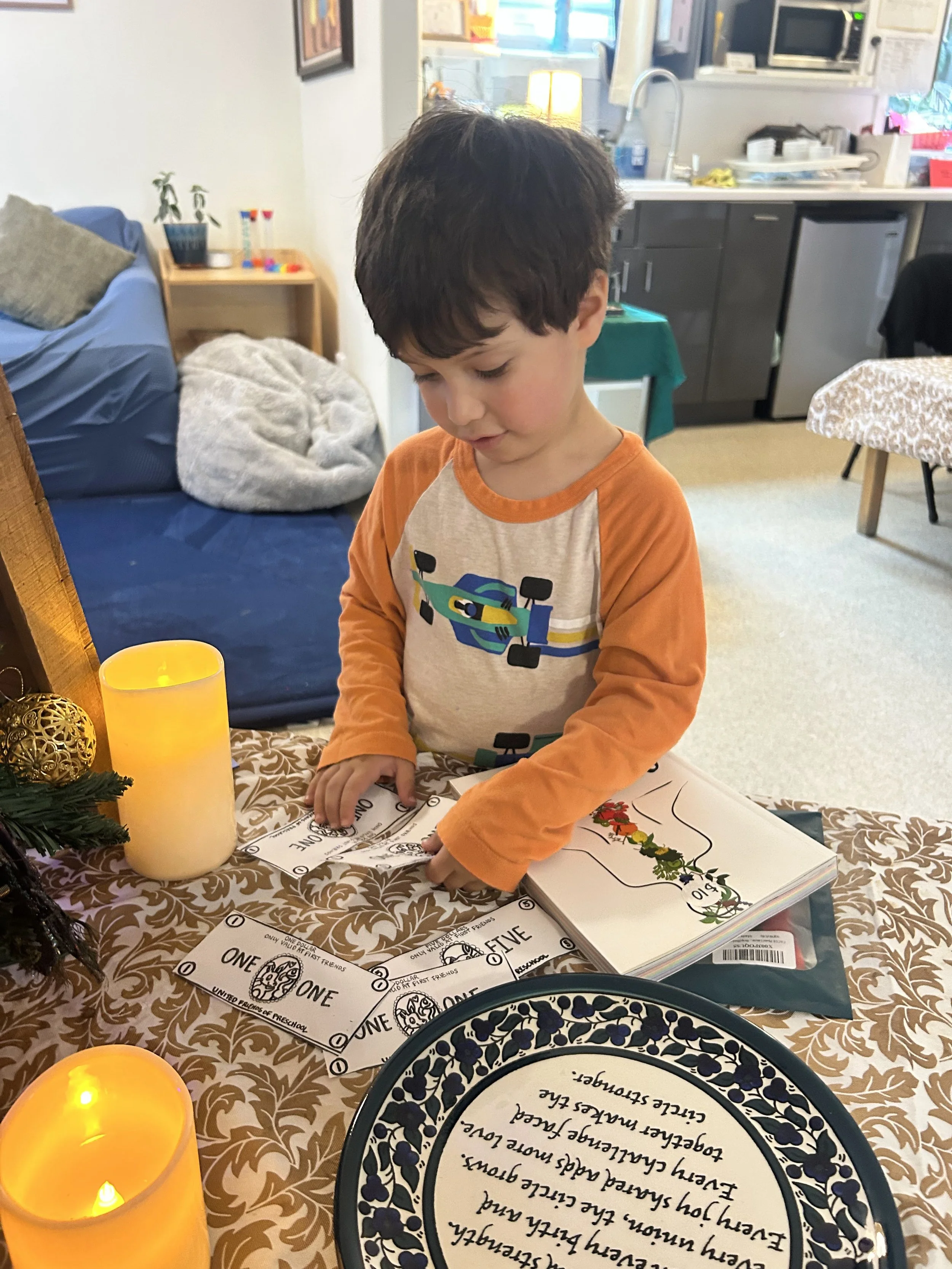 As the holiday season ramped up in our community, we strived to embrace the winter wonder and bring it into the classroom. We decorated our mudroom with holiday lights and asked each child to share their favorite thing about winter for our gallery wall. We continued to bring winter themes into our classroom projects and children created a variety of ornaments using cool-colored paints and snow-like glitter, to hang in our mudroom and eventually take home. Our miniature Christmas tree, adorned by the children, and our menorah became a part of our everyday environment. All of the work we put into creating a “winter wonderland” at school contributed to the children’s sense of belonging and connection. It fostered their sense of connection by giving them a universal link to each other and our community.