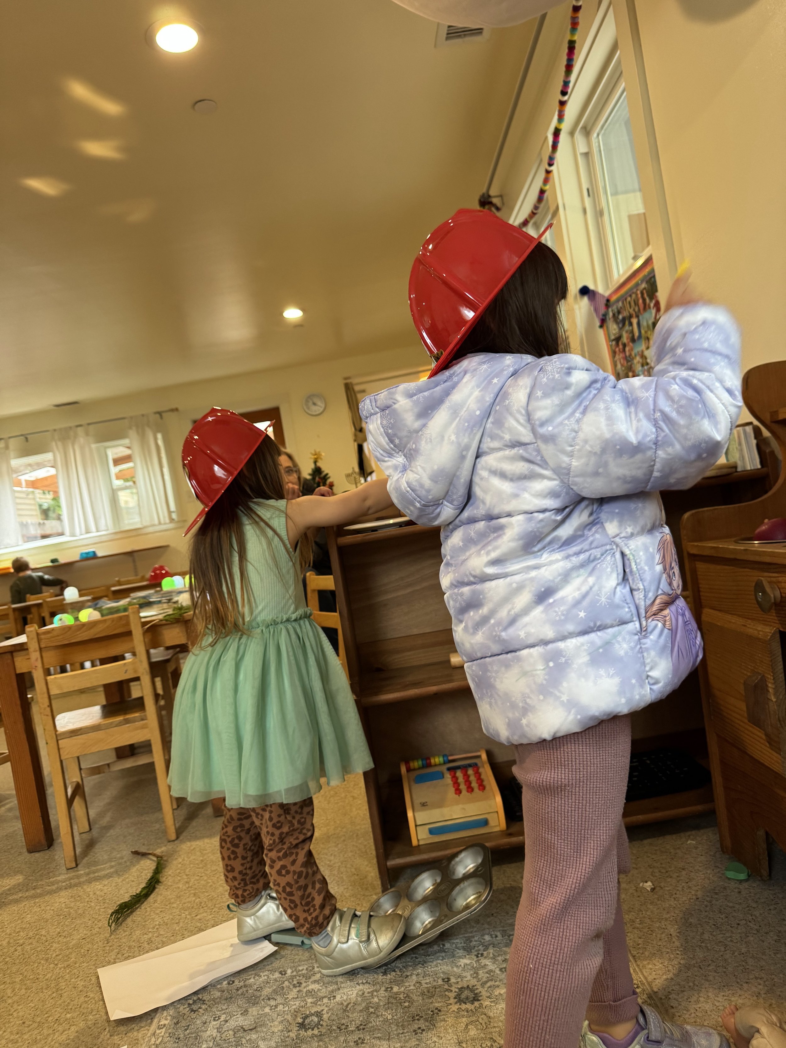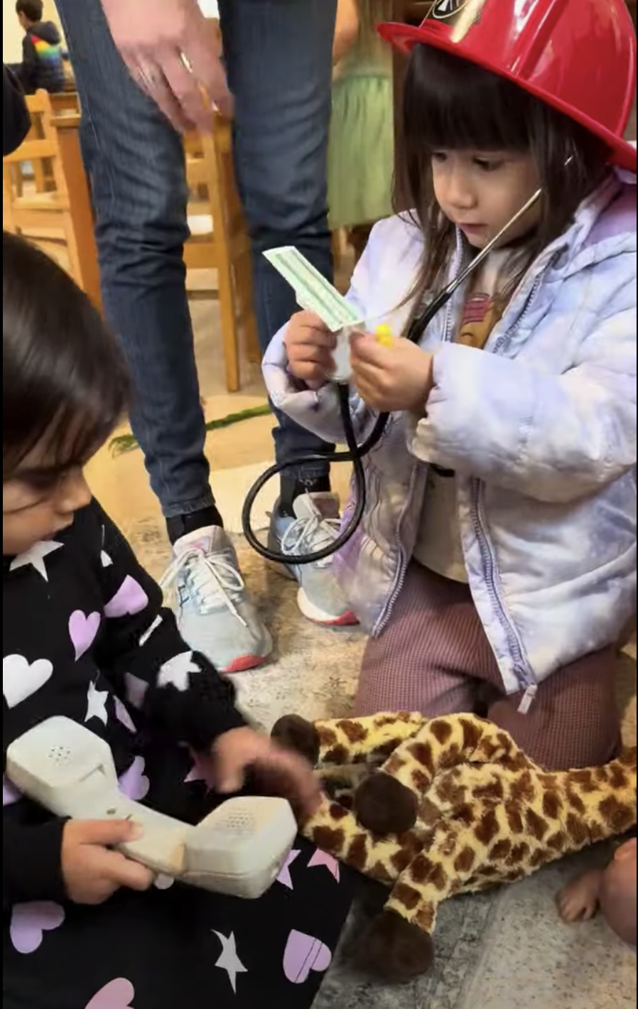 Each child proudly handed their toy donation to “Captain Santa”, making the idea of giving concrete and meaningful. When we returned to the classroom, the learning continued through play. Many of the children gravitated toward the dramatic play area, where they recreated the experience together. Wearing firefighter hats, Eisley and Sloane took on leadership roles, asking, “What is your emergency?” and carefully listening to their peers. Arthur, Kiran, Miko, and Sylvie soon joined in, and through their collaborative play the group shared new understanding about calling 9-1-1 and how helpers respond in an emergency. Teachers observed children negotiating roles, taking turns, using new vocabulary, and supporting one another as they worked through imagined scenarios.