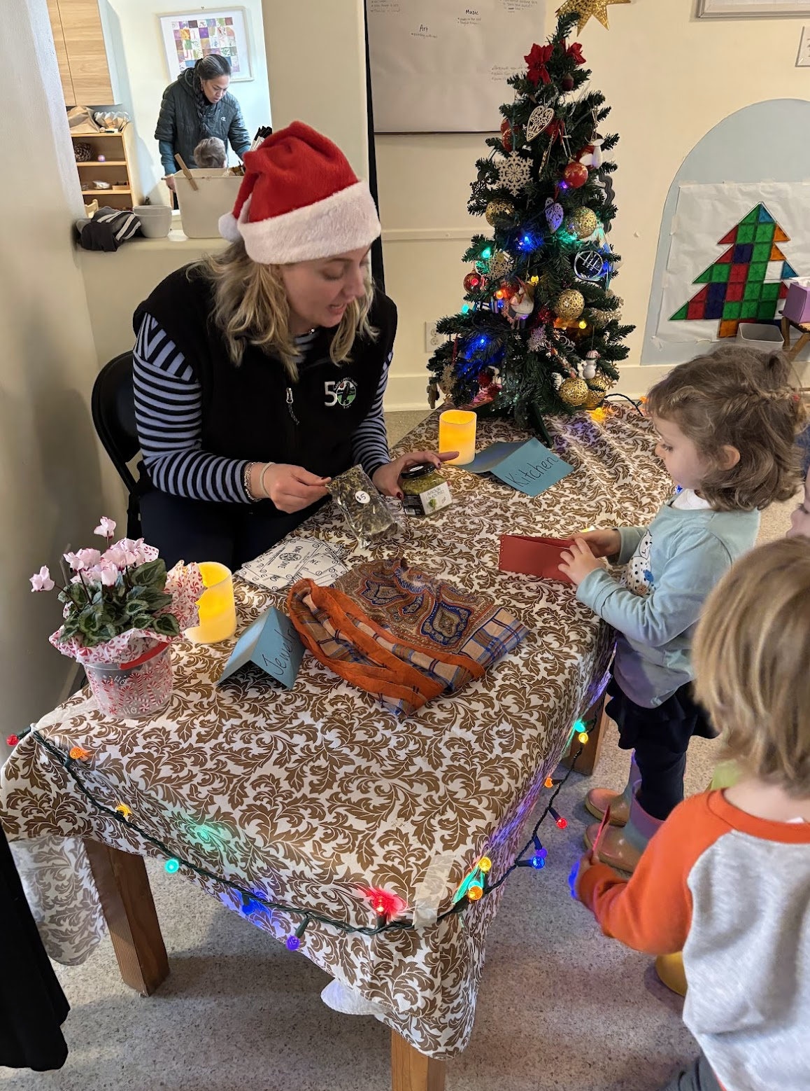 After shopping, Teacher Jocelyn created a wrapping station where each child spent one-on-one time sharing which gift was for whom and choosing their preferred wrapping. This quiet moment of reflection supported autonomy, intentionality, and pride in their work (and resulted in what we estimate to be over 50 beautifully wrapped gifts!).